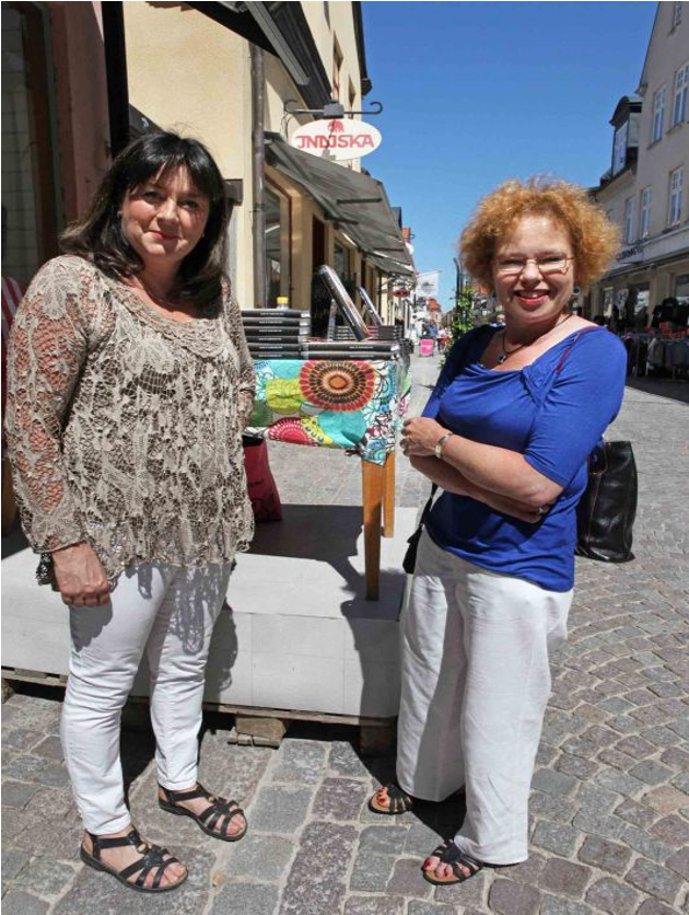 Afgelopen zaterdag stond Visby op het programma, de middeleeuwse Hanzestad die op de Werelderfgoedlijst van de Unesco staat. Omdat het seizoen nog niet is begonnen (start met midzomer), was het er erg rustig. In de zomer daarentegen kun je er over de hoofden lopen. We bekeken wat ruïnes en mooie straatjes, genoten van het zicht op de stadsmuur en hadden nog een leuke ontmoeting. Tineke wilde in een boekwinkel even het boek voor de leeskring kopen (hadden ze overigens niet, is inmiddels elders aangeschaft). Voor de boekwinkel stond een bord over een signeersessie van auteur Anna Jansson die van Gotland komt en wier boeken over Maria Wern zich op Gotland afspelen. Tineke heeft alle tot nu toe in het Nederlands verschenen boeken van Anna Jansson vertaald. De meeste van “haar” auteurs heeft zij persoonlijk ontmoet, maar Anna Jansson niet. Laat die signeersessie nou net op dat moment zijn. Anna Jansson zat gewoon voor de boekwinkel, op straat, te signeren! Dat was dus een erg leuke ontmoeting! Marcel kocht nog een boek dat hij liet signeren, en de foto van Anna en Tineke komt in september op Tinekes website bij de overige ontmoetingen (www.sveatrans.nl). Waren wij blij dat we ons voor het bezoek aan Visby hadden “gekleed”.